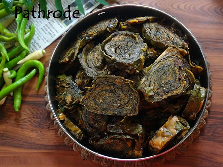 - 5.Place the inner filling mixture along the spine of the leaf, right in the centre, in the middle of the leaf. Patholi's sweetness also depends on the amount of filling (choornu) you place inside each patholi. So, if you want your patholis to be very sweet then place lots of filling (choornu) in the centre of each leaf.