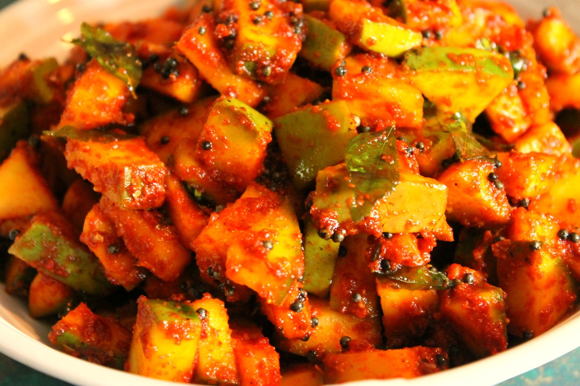 - Wash and chop Raw Green Mango into bite sized pieces. Add good enough salt and leave them aside (salt cure) for 2-3 days. Store and refrigerate if required. This is called 'Karmbi'. The day you are making pickle, thaw them and leave aside. Grind Red Chillies in grinder, add Turmeric powder and globular Asafoetida and Mustard seeds towards the end. Do not add salt as the Mangoes already have salt. Allow the powder to cool off for couple of hours. Spread on a wide tray if required. Once cool, add the powder to Mango pieces, add enough water as desired. Mix well. Asjust and add salt if required. Leave aside for couple of hours. Store the pickle in a clean non-reactive glass/ ceramic/ porcelain jar. Refrigerate and consume within 2-3 weeks or till the Mangoes do not turn squishy and soft.