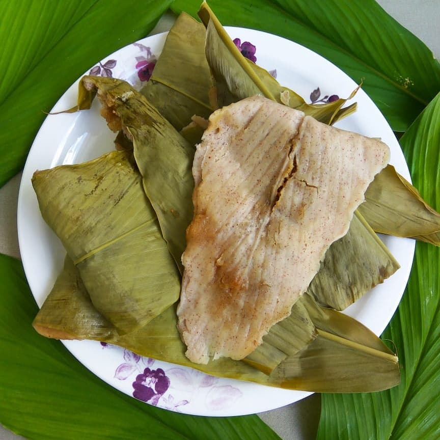 - 6.Fold the leaf vertically into half, along the spine. Continue this process until all the leaves/rice batter is used up.